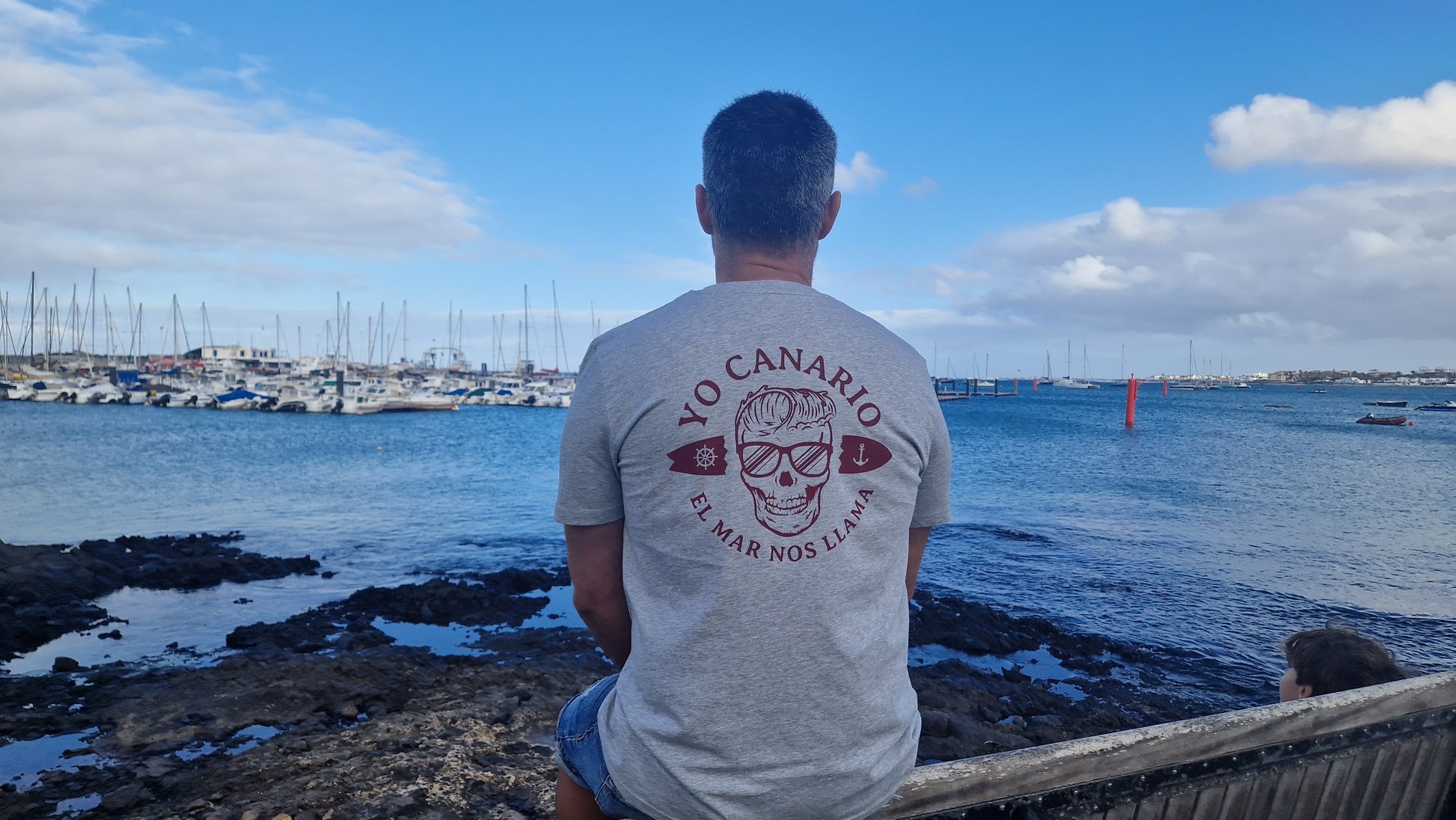 Camiseta en color gris con diseño "el mar nos llama" y calavera en color burdeos. Elaborada con algodón orgánico, tintas en base agua. Producto apto para personas veganas.